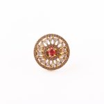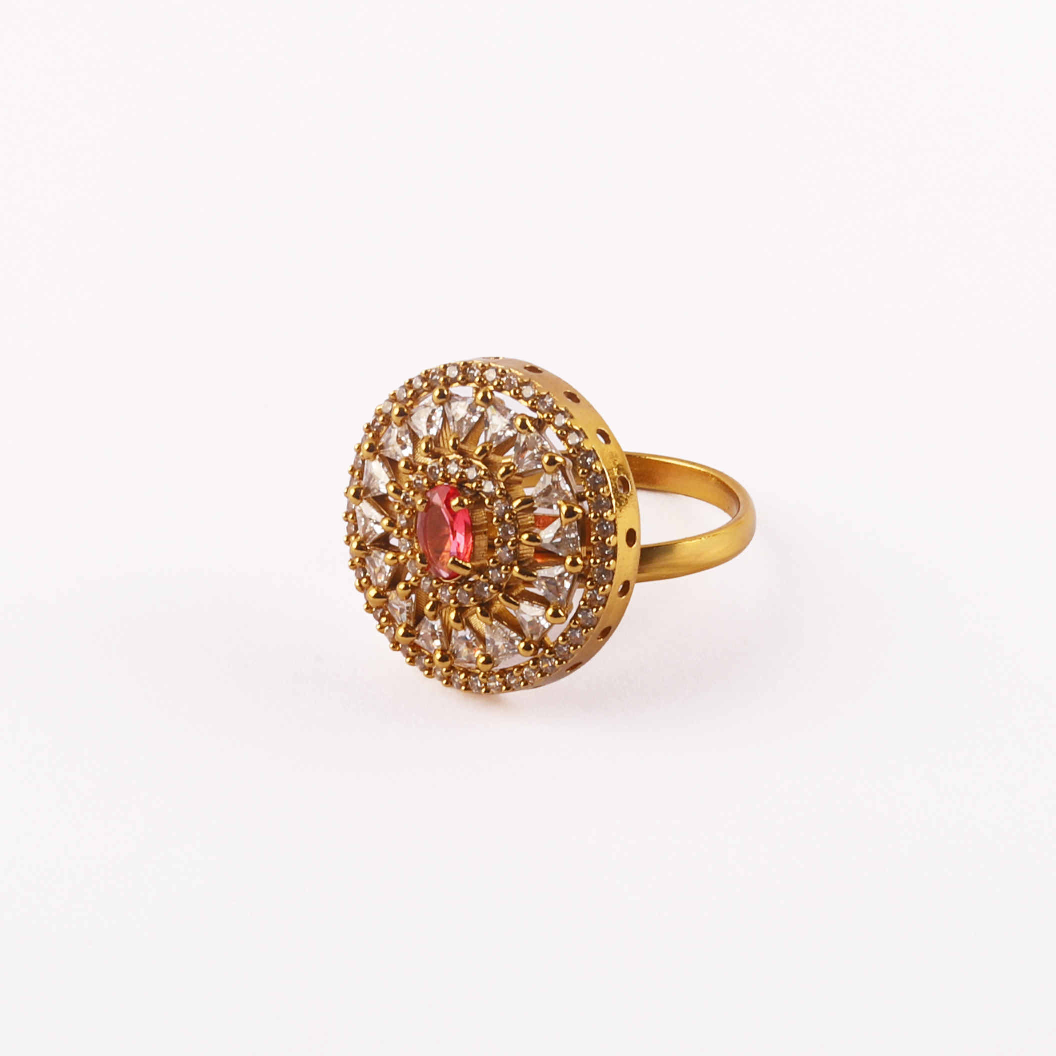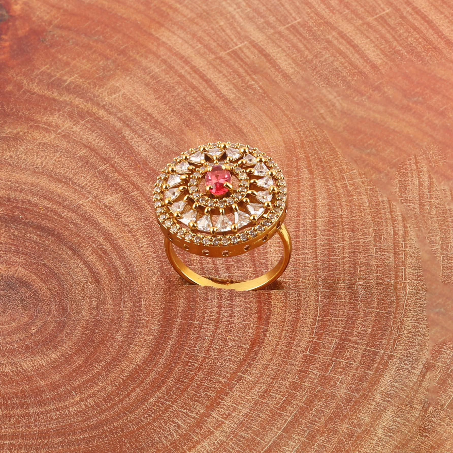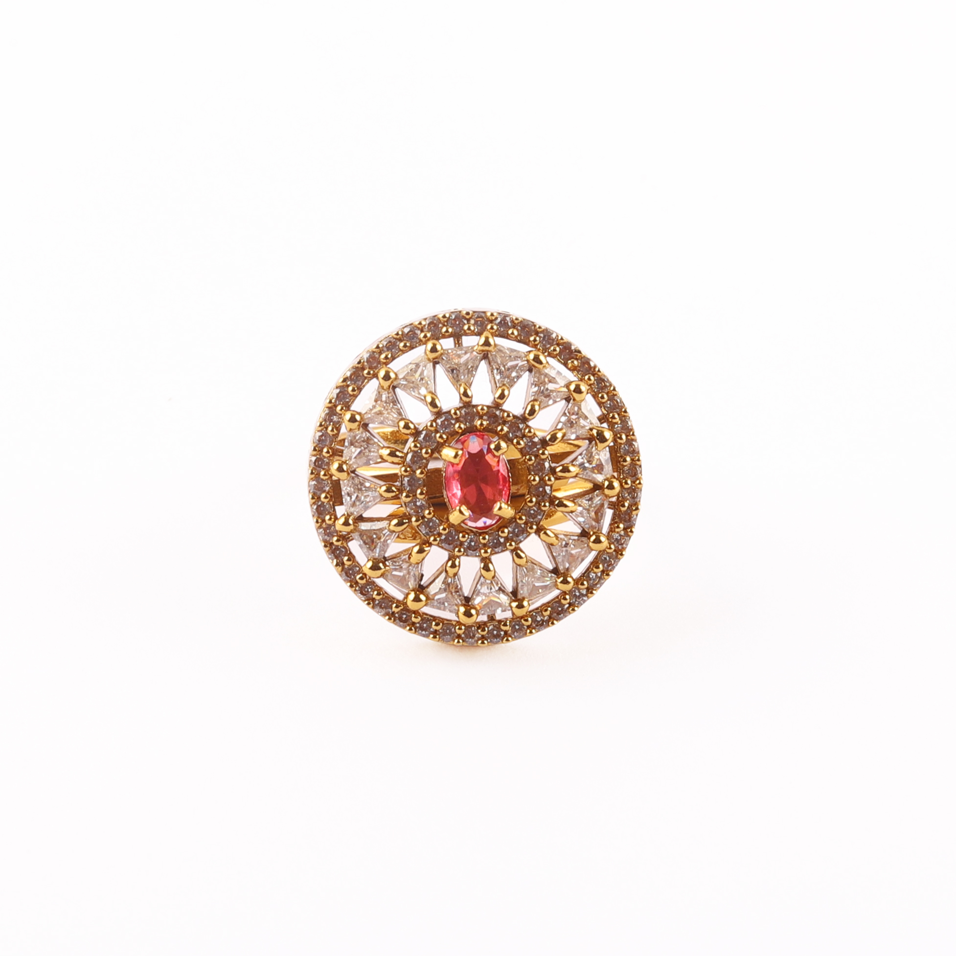 This Kaakshi Jewellery ring is a radiant blend of classic design and modern elegance. Crafted with a rich gold-tone finish, the ring features a striking oval center stone in a deep ruby hue, surrounded by meticulously set sparkling American diamonds. The circular arrangement creates a floral-inspired silhouette that reflects light beautifully, making the ring a true statement piece.