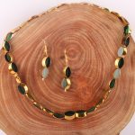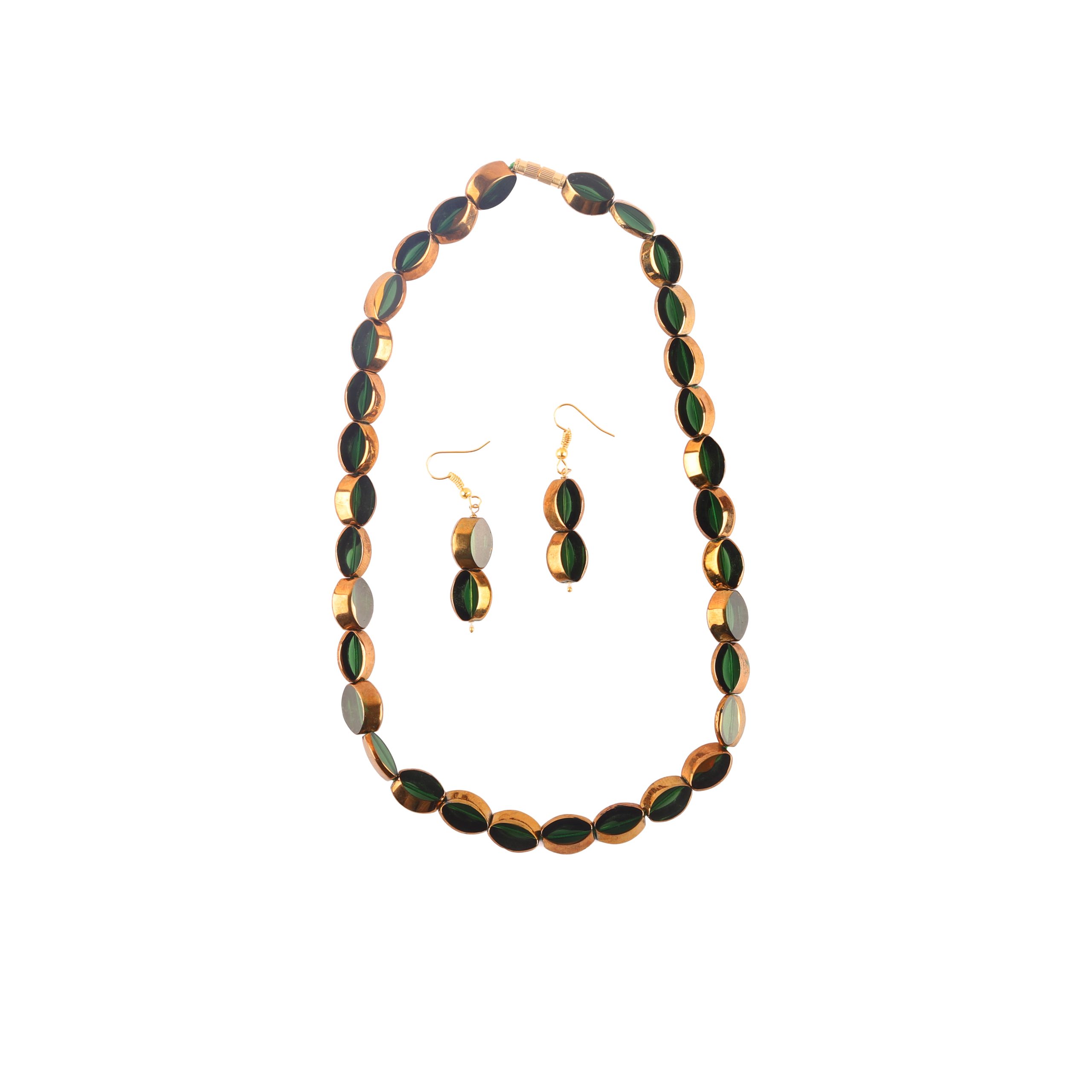 his Kaakshi Jewellery neck string set is a refined expression of elegance inspired by nature’s deeper hues. Crafted with oval-shaped beads in rich green tones, beautifully framed with a warm gold finish, the design strikes a perfect balance between tradition and contemporary style. The subtle contrast of color and metal gives the set a graceful presence that feels both calm and distinctive.