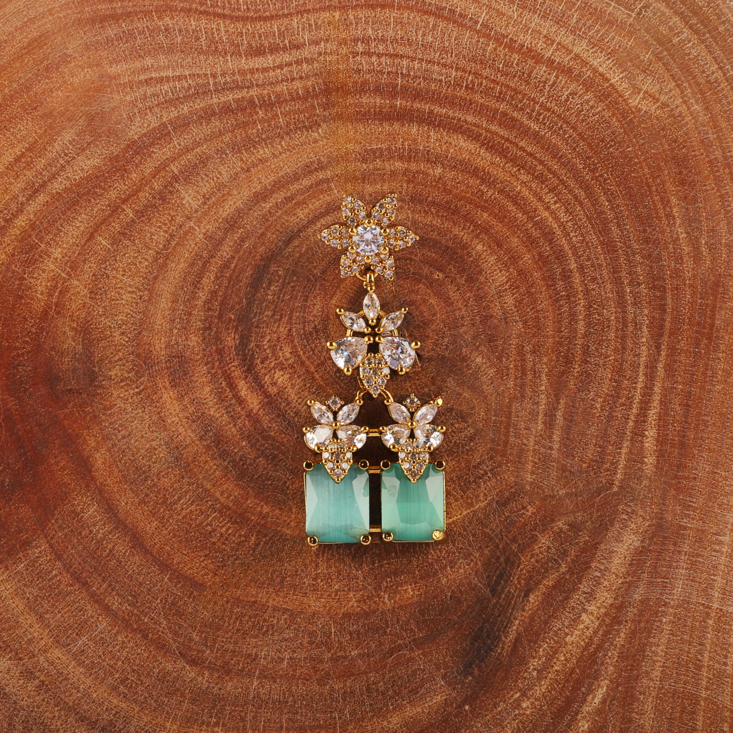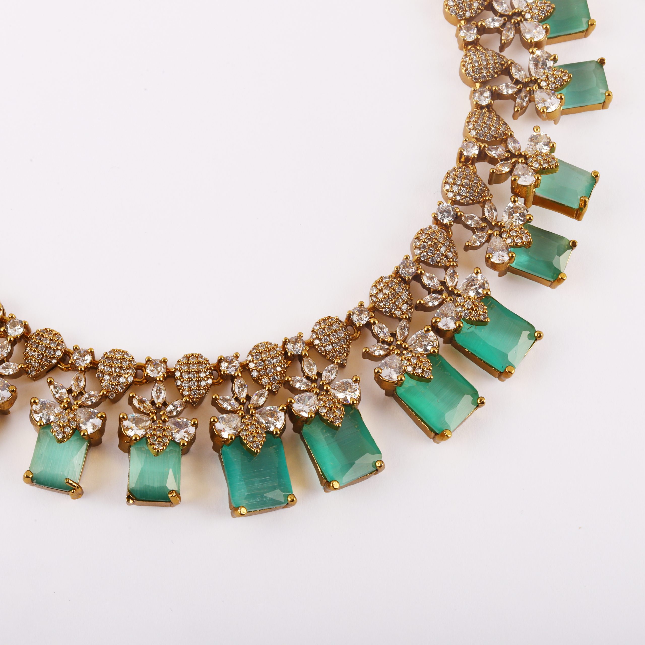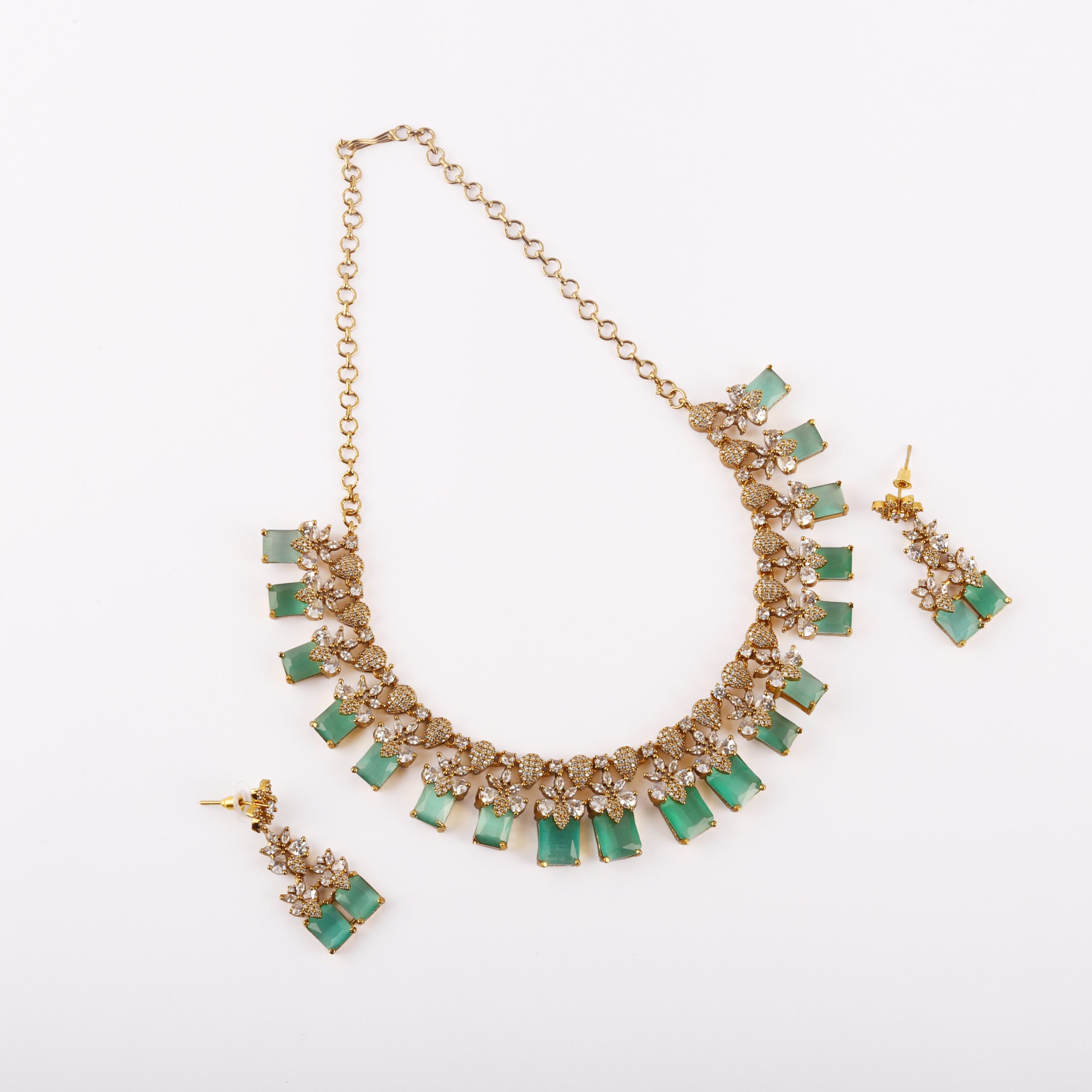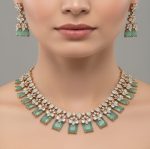 This exquisite necklace set showcases the timeless charm of emerald-toned stones paired with brilliant crystal detailing, crafted to reflect elegance and sophistication. Designed with precision, the piece features a harmonious blend of classic floral motifs and modern rectangular drops, creating a graceful statement for special occasions.